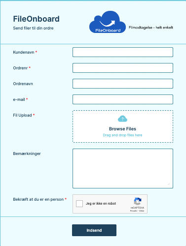 Formularen indeholder felter, som skal udfyldes, så du sikrer dig altid at få de relevante informationer fra kunden sammen med filerne.
